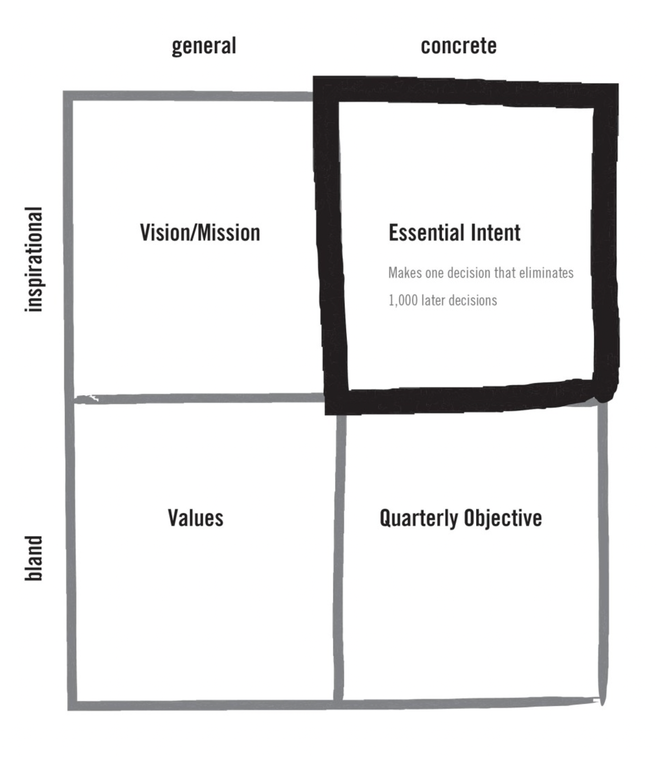 A company’s mission is meaningful but general, its values are bland and general, and its quarterly objectives are bland but concrete.